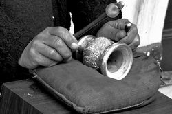 BETO su oficio: ARTESANO, más de 20 años de profesión, oriundo de Barracas. El taller … un pasillo, una silla, un almohadón, ese viejo parlante que ya no emite sonido. Su música es el cincel sobre el preciado tesoro. Hablamos sobre su trabajo y la fotografía, cuento sobre mi trabajo y accede a ser fotografiado. El color de su cabellera conjuga perfectamente con el plateado de su obra Entre foto y foto le cuento donde puede estudiar. Algún día espero encontrarlo con la cámara en mano